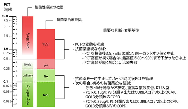 血液培養の結果が出るには数日かかることがあり、感染症診断の正確度には限界があるので、臨床スタッフは、PCT濃度によって抗菌薬による早期患者管理を開始することが可能です[3-5]。